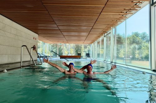 A Brazilian who had seen our bikes from the terrace was very interested in our “Less-is-More-Tour”. He followed us and wanted to explain us the way out of town, and then biked ahead so we could follow him. He showed us where the thermal baths were and that even the Romans knew already about the hot springs. The park was fairly newly renovated with wooden decks bridging down from the steep city walls, but the bath looked like it had not seen any renovation since it was built in the 1980-ies.