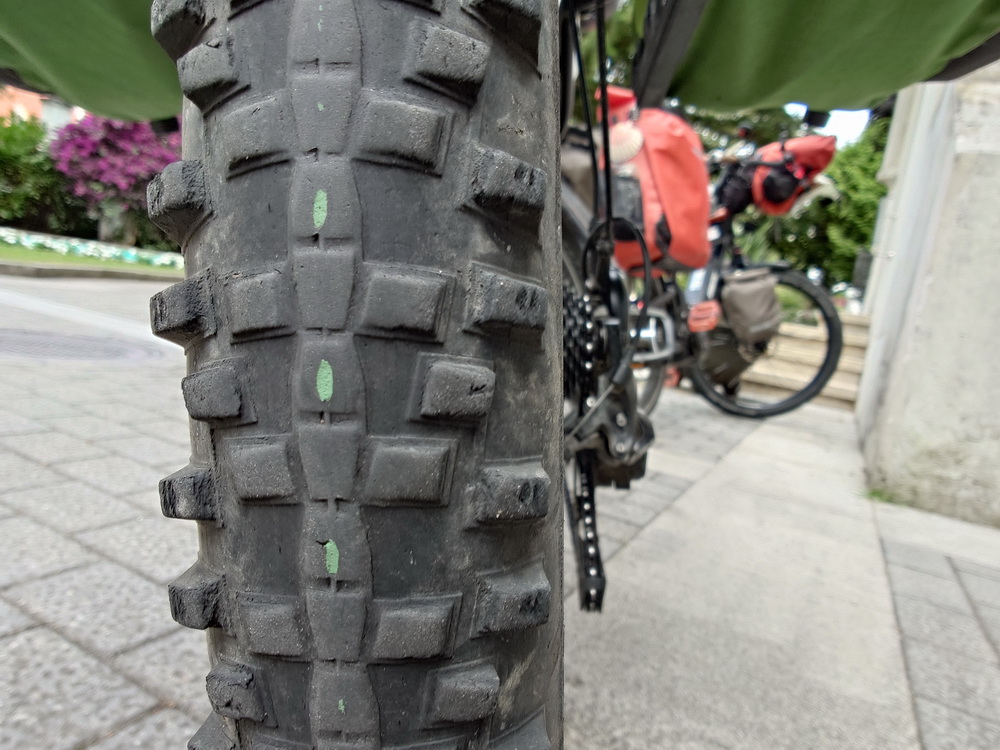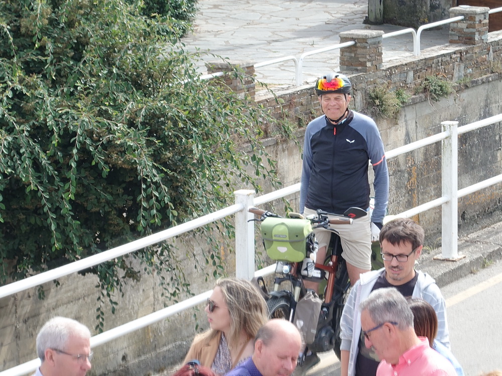 In the morning we had a close look at Robert’s rear tire and it looked already quite tired and used, because the inner material started to show. We saw there was a bike shop in Navia, but it was closed and we took the risk to continue. But for the pilgrims there is always a Saint watching us.