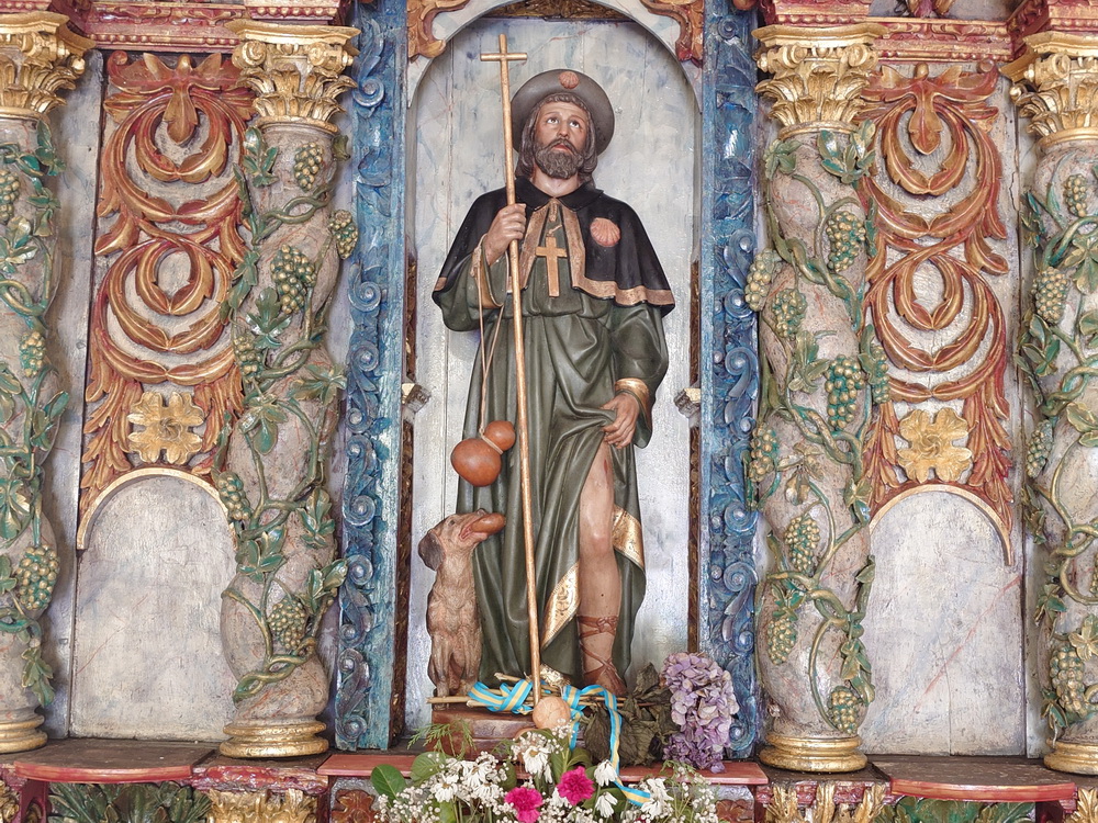 It turned out to be Saint Roch de Montpelier. A pilgrim, who had been on his way back from his pilgrimage to Rome in the 13th cetnury, healing victims of the plague. When he was finally infected himself he was hiding in a wooden cabin near Piacenza, and a dog brought him some bread every day until he was healed. Returning to the people, they didn’t recognize him due to his scars, and imprisoned him as a spy for five years until he died. That’s why you see him always showing his scars, being accompanied by a dog carrying some bread in his mouth.