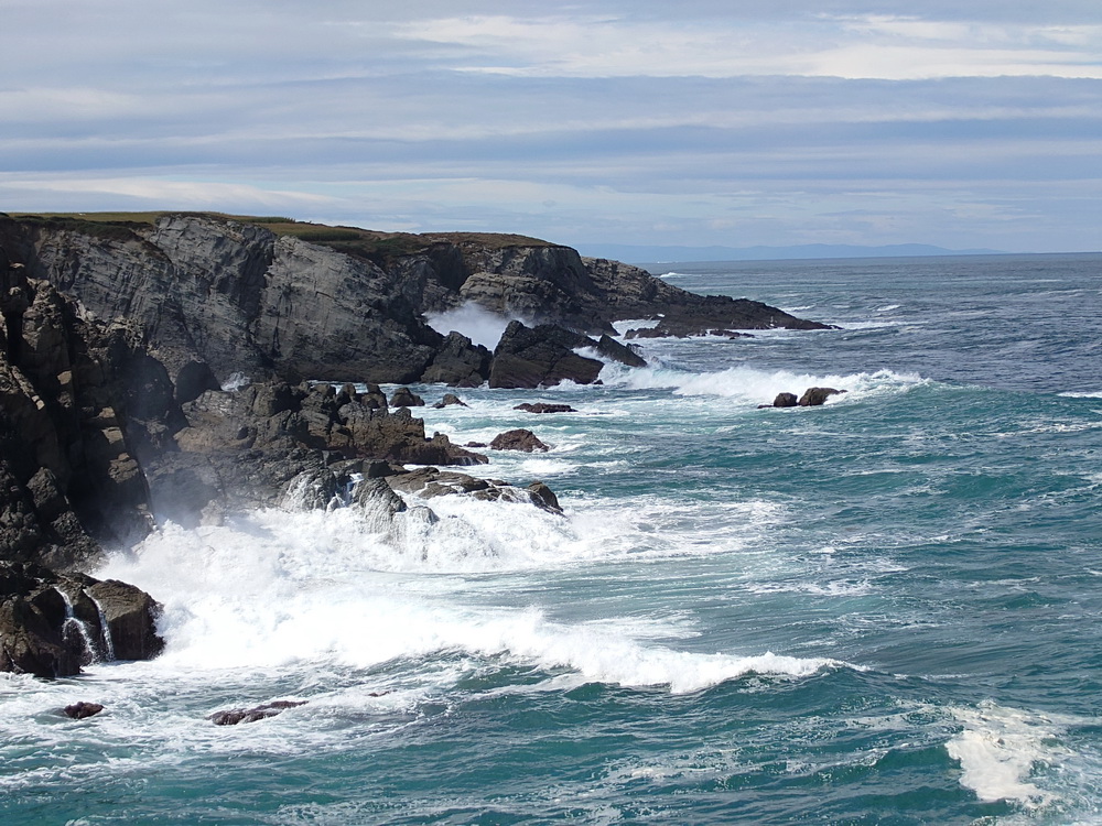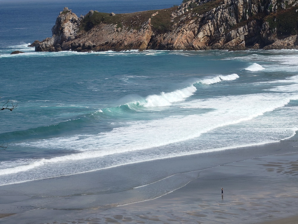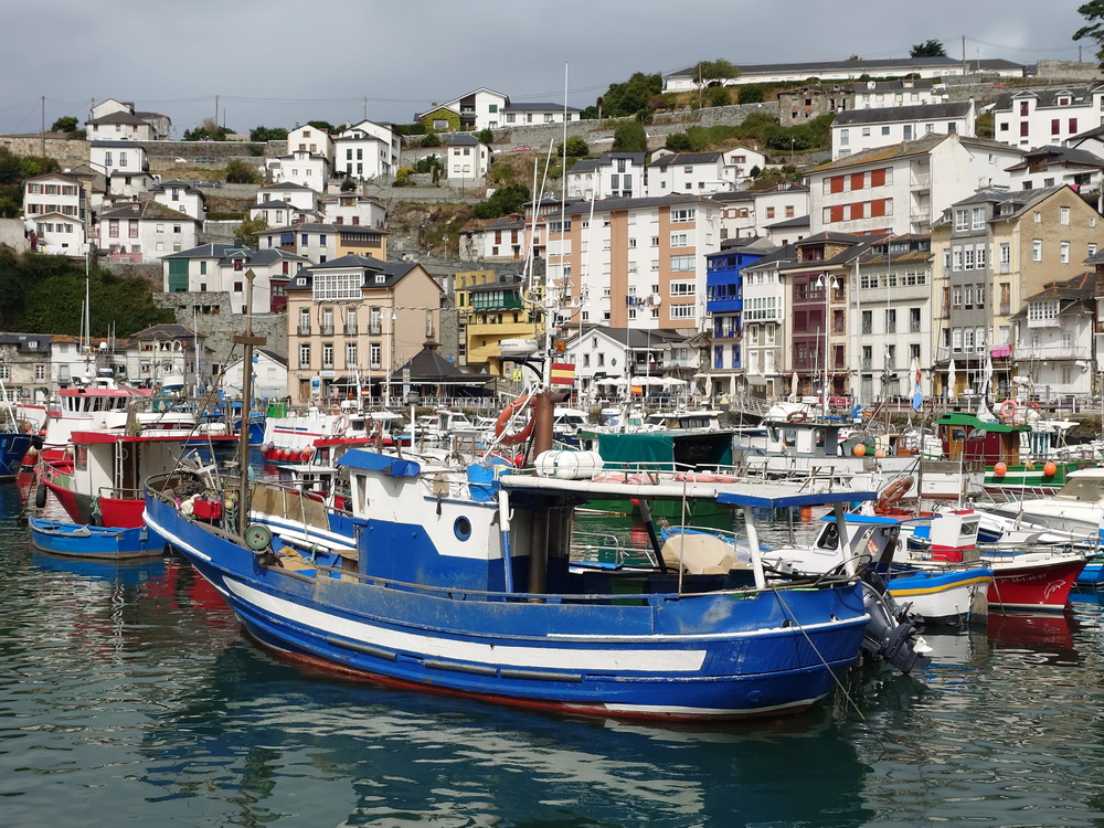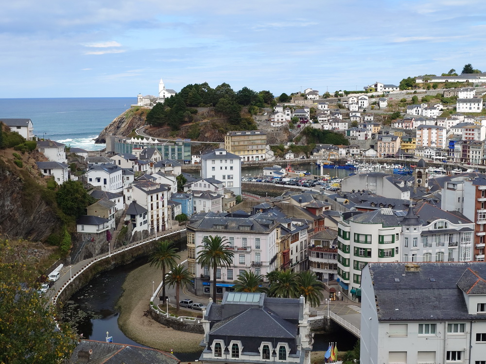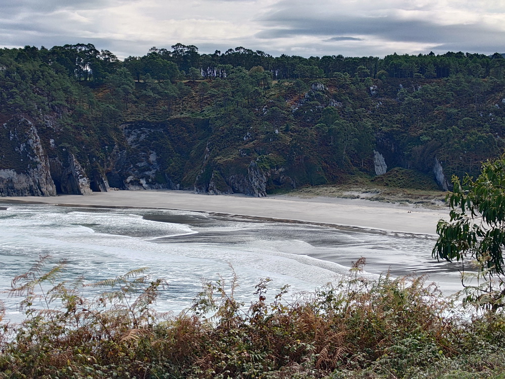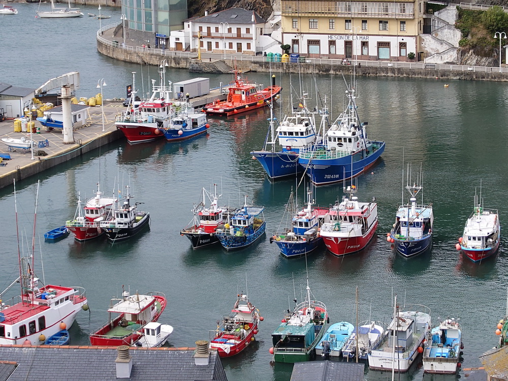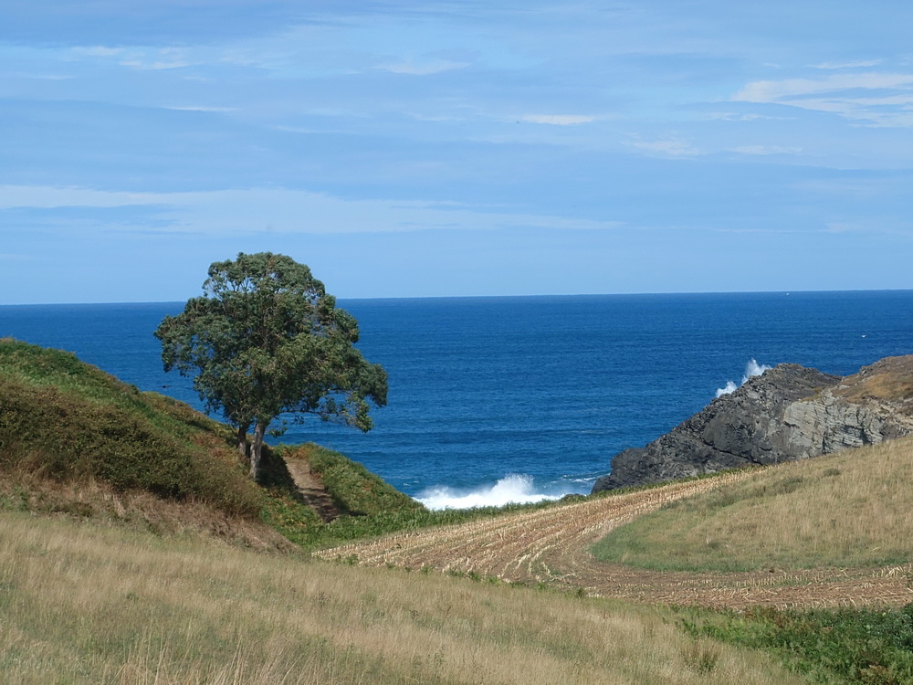 Our next stop was the natural harbour of Luarca, which was hiding behind steep cliffs at a river mouth. Robert knew this place already, because he once had sailed to this port with his friend Diederik. We had lunch at the restaurant of the hotel Baltico and were enjoying seafood. At the next table we saw for the first time a machine to add air to cider from a bottle. We would see a lot more of those in the coming days. After a visit by the pier we tried to find our way out of town, but there was a complicated system of one way streets, which kept us busy zig zagging from one river side to the other to finally climb the steep roads out of the place. Being back up on the cliffs and the fields behind them we could see from the mountains to the sea a huge rain front rolling in.