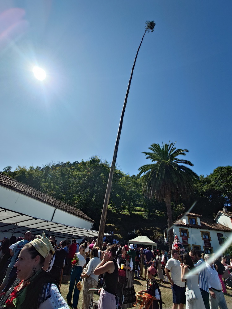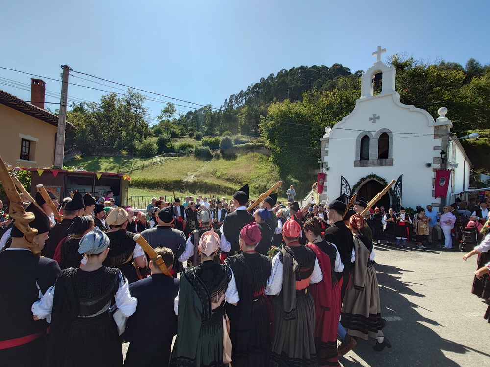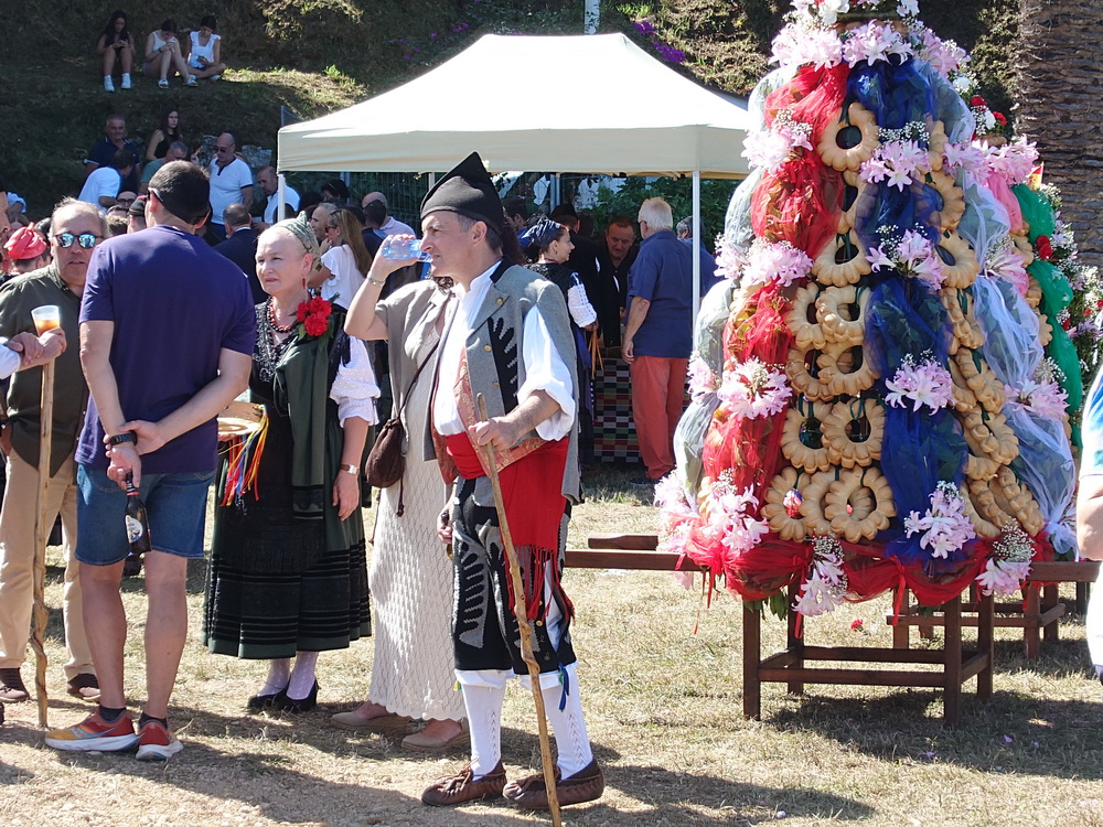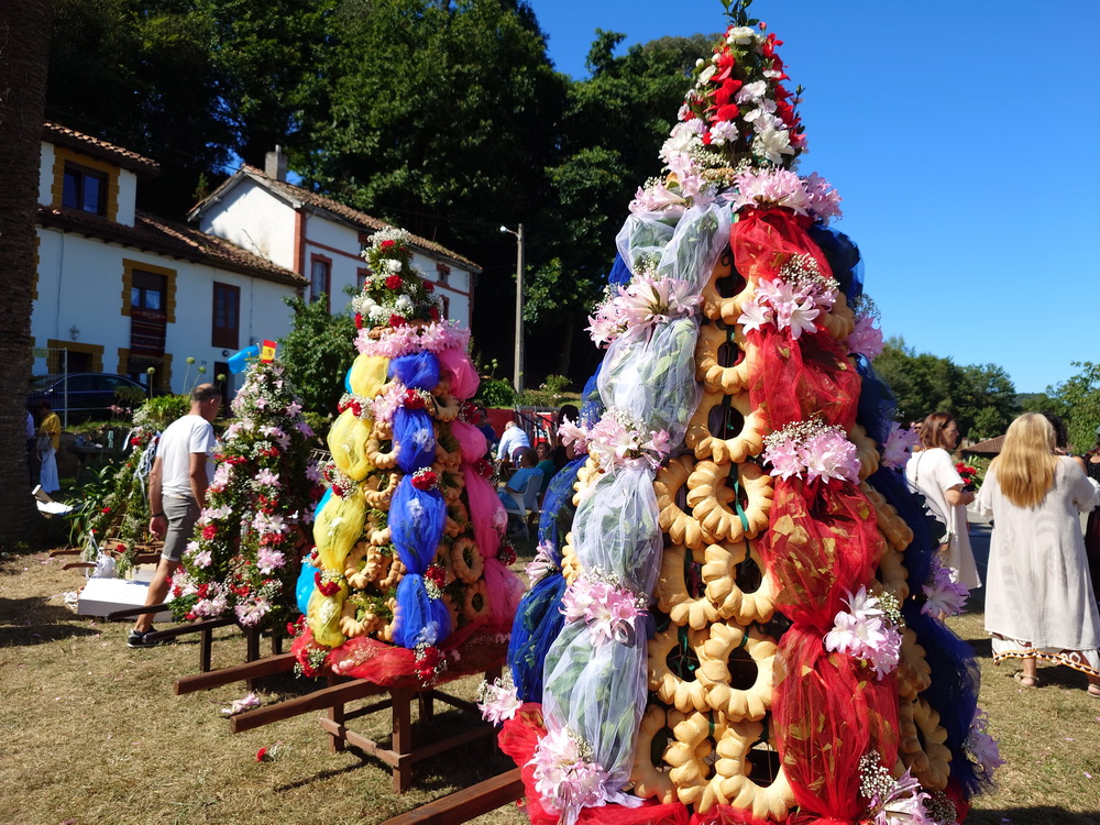The road was so crowded that it was impossible to pass with our bikes. Huge sculptures of branches decorated with flowers and bread called “Ramu” were part of the procession and were set beside the chapel. The men had beautiful traditional Llanes costumes called “Porruanu”, which show leaves and palm branches as vegetal patterns on their jackets and trousers, related to the tree they carry. It’s a rite of passage from childhood to juvenileness. The women’s dresses were East-Asturian traditional Llanes costumes which were called “Indianos”, because they were related to the Spanish emigrants who returned wealthy from the Americas.
