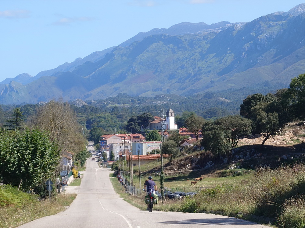 After Berbes we had an unexpected view into a wild canyon of the Río de Vega. A winding road led us into this spectacular gorge cut into lime and sandstones, which stood like towers into the sky out of the river bed. A school class was on its way to the beach of Vega, which looked so beautiful. But we had to continue and gain altitude again from sea level up to the rolling green hills of San Esteban de Leces, from where you could clearly see the Picos de Europa which were topped by lentil clouds. It was such a beautiful landscape that I used my GoPro to film it on a fast downhill run. I thought I had Robert behind me, but I lost him completely. I was waiting for him, but he didn’t show up. At the end I had to call him and bike all the way back to Abeu from where we took the main road downhill instead of the cliff road close to the cliffs with dinosaurs footprints. But you can’t have it all.